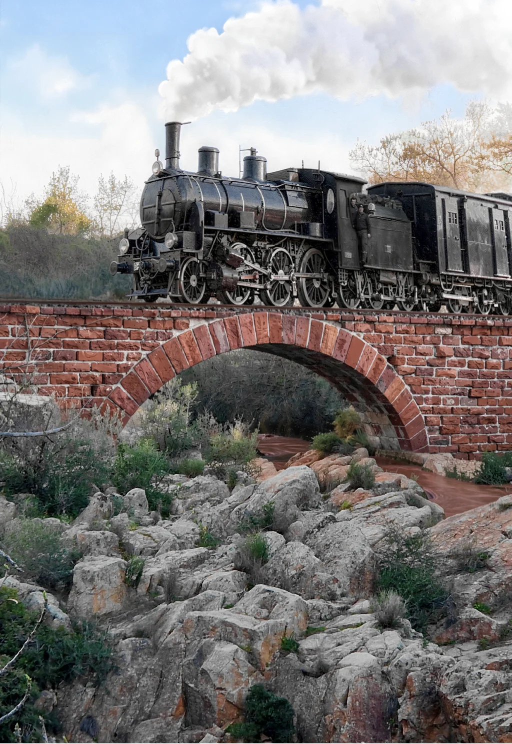 Nuestra composición apuesta por un enfoque fotorrealista con fuerte carga narrativa mostrando una locomotora de vapor avanzando sobre el puente de Vadollano, reinterpretado este con una ampliación en ladrillo rojo y unos raíles que allí nunca existieron. El entorno rocoso y el cauce color chocolate del Guarrizas evocan el paisaje real del enclave mientras que el cielo abierto aporta contraste y profundidad con una atmósfera luminosa y dinámica.